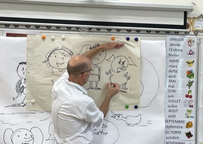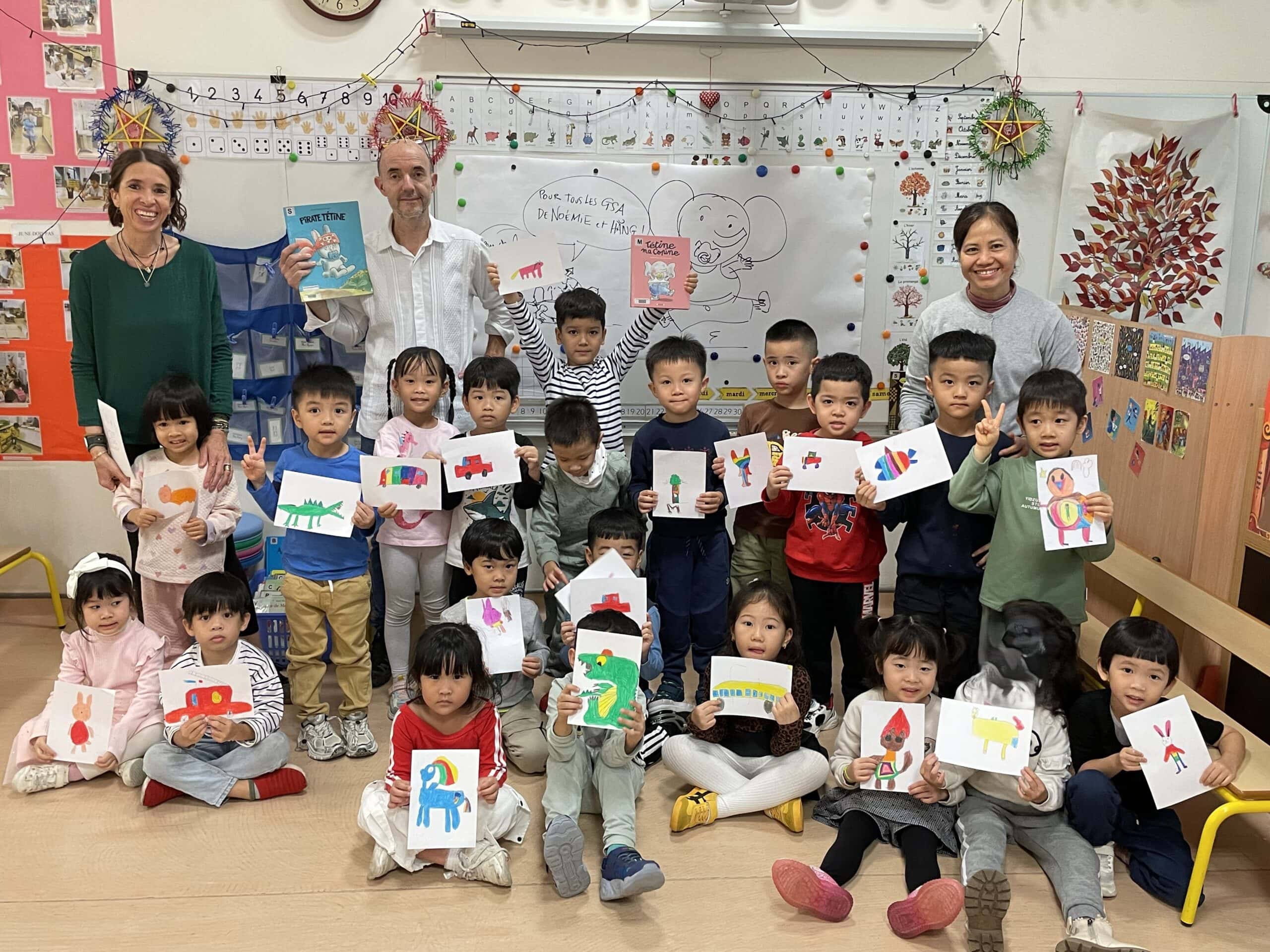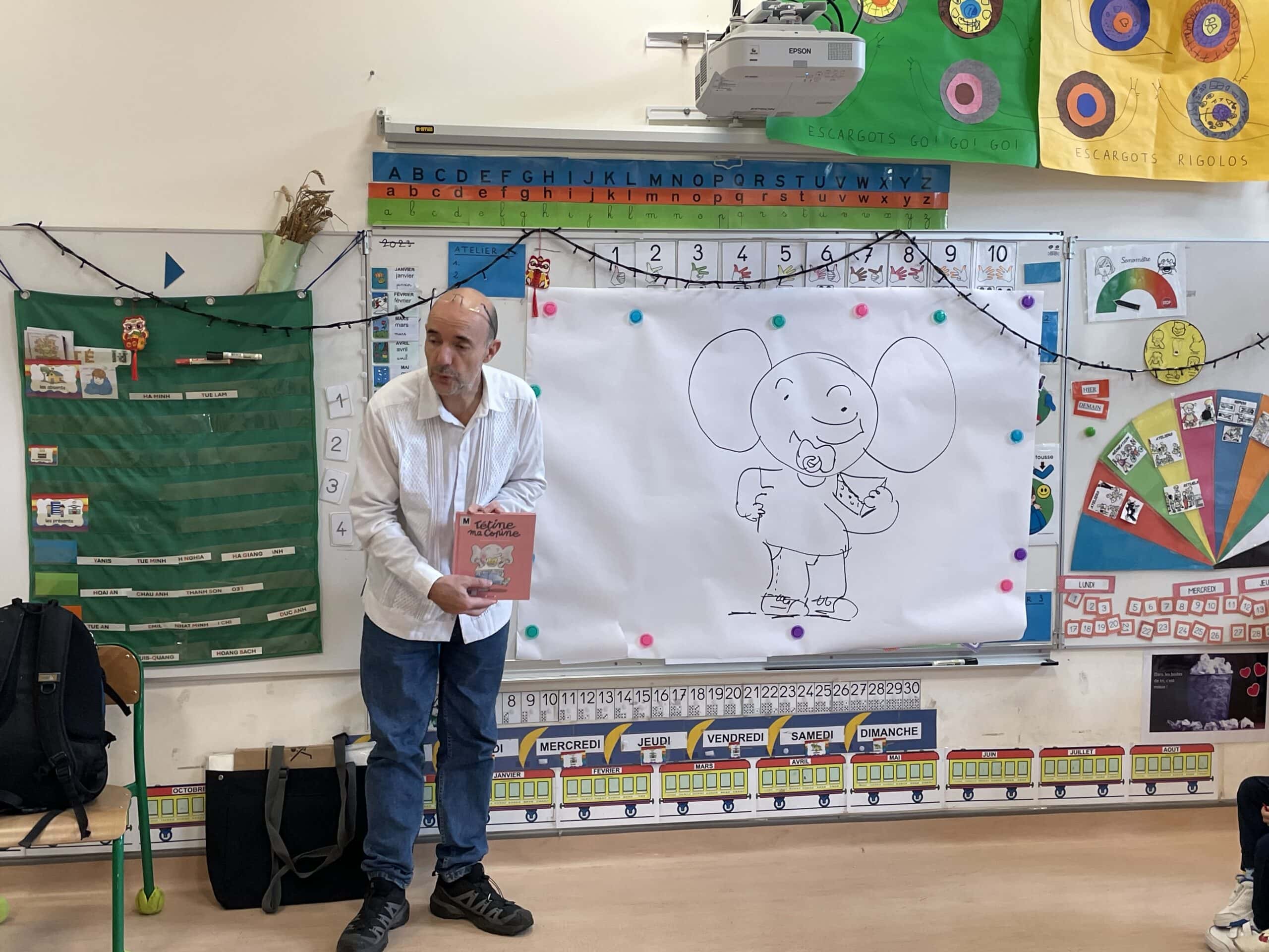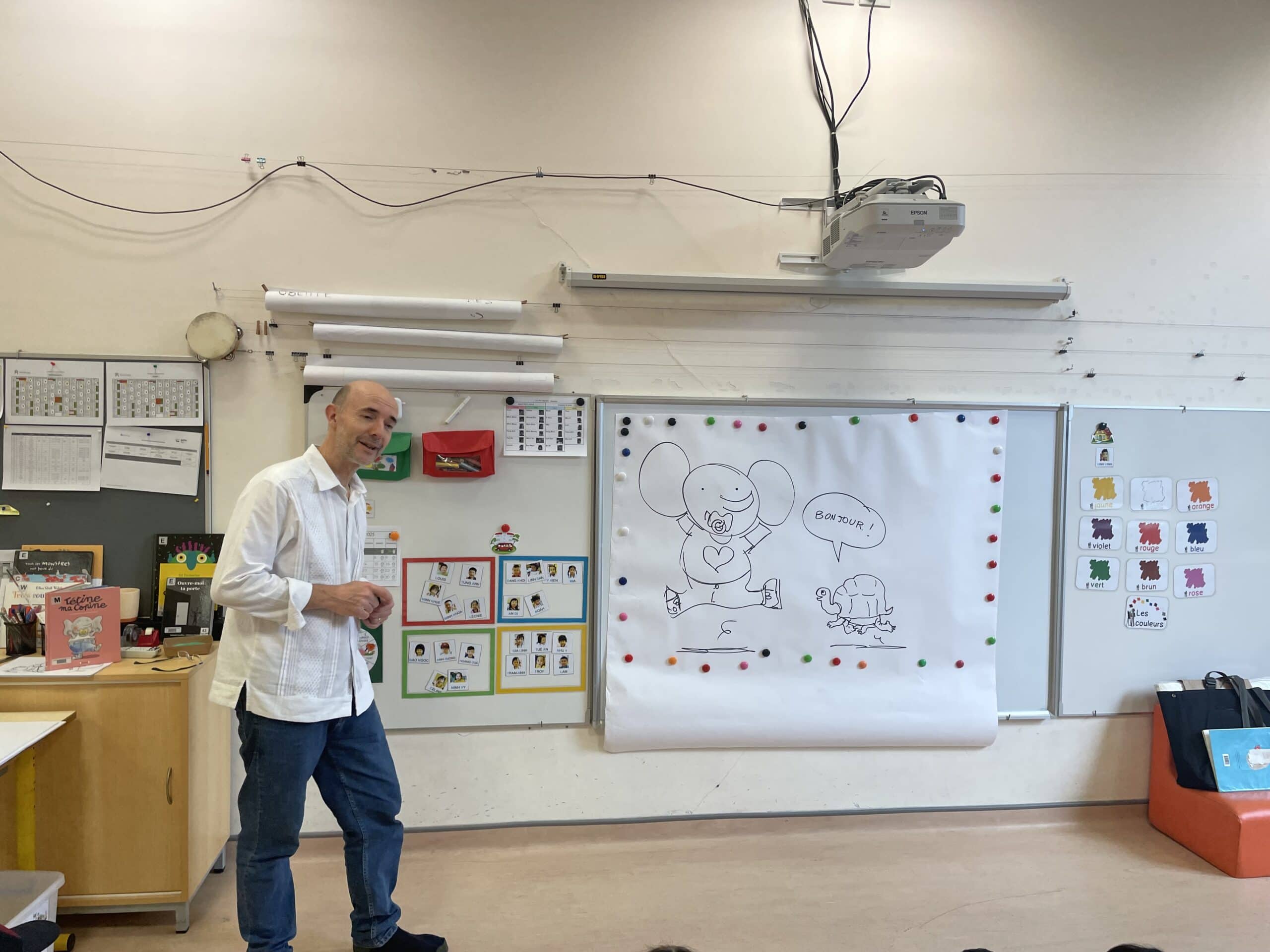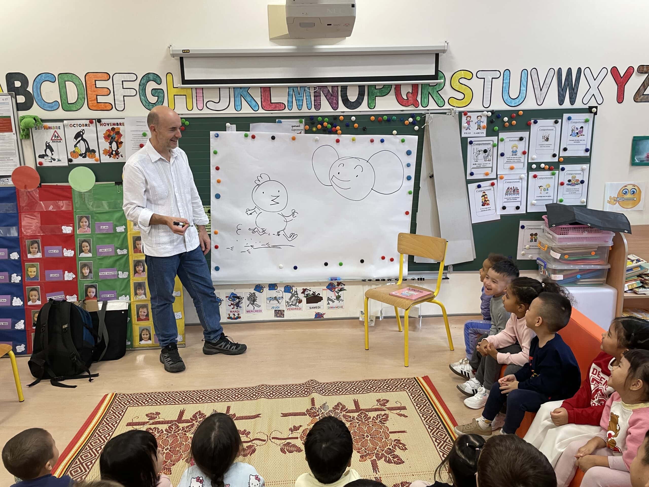 Il a parlé avec les plus petits de ses histoires (PSA, PSB et MSB) tout en leur montrant comment dessiner des formes simples. Il a travaillé sur les émotions avec les plus grands (GSB) et a découvert les textes et les dessins réalisés par les enfants sur leur doudou (GSA).
