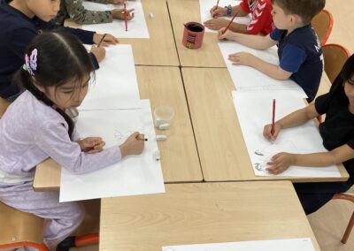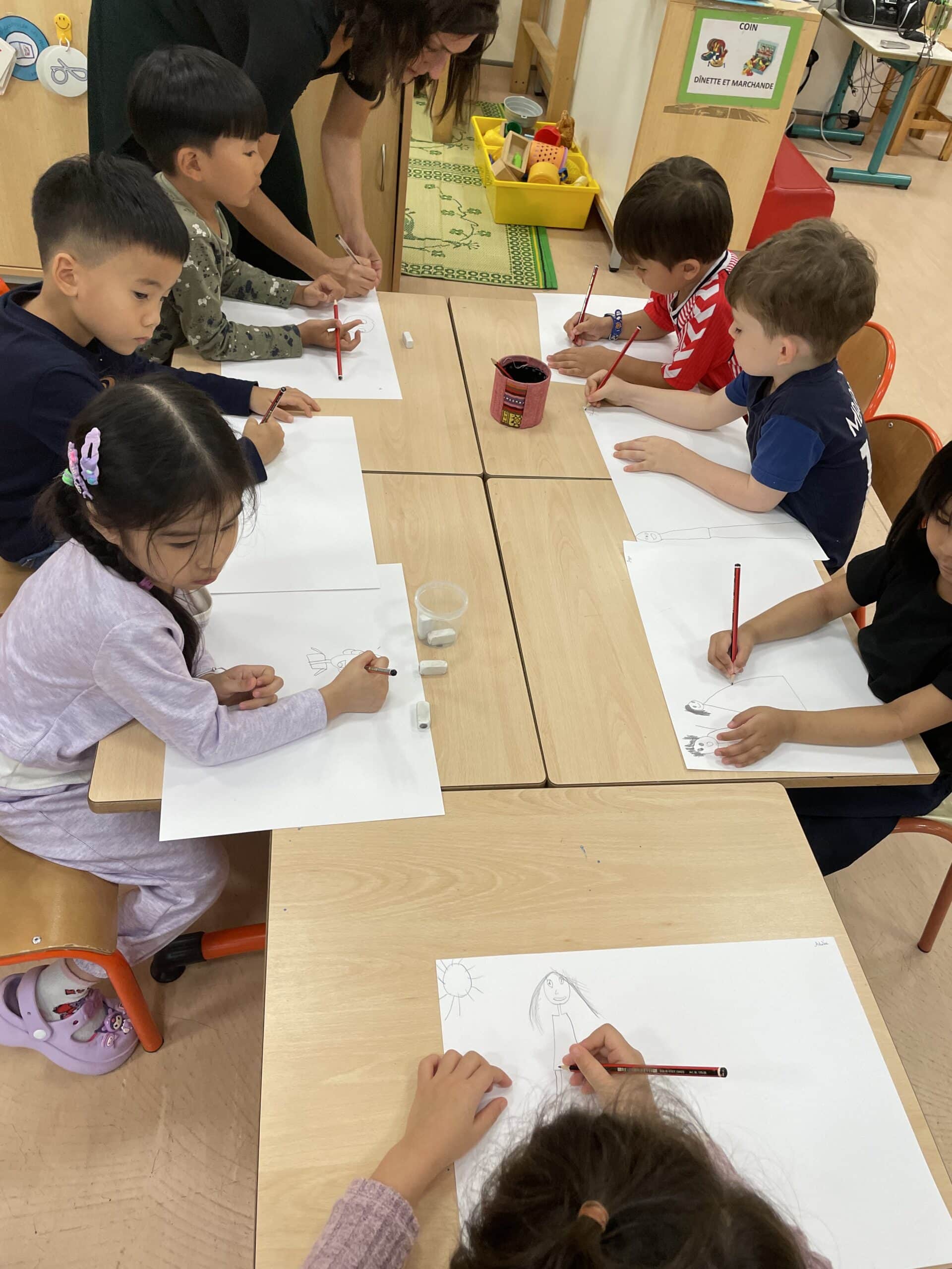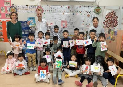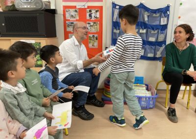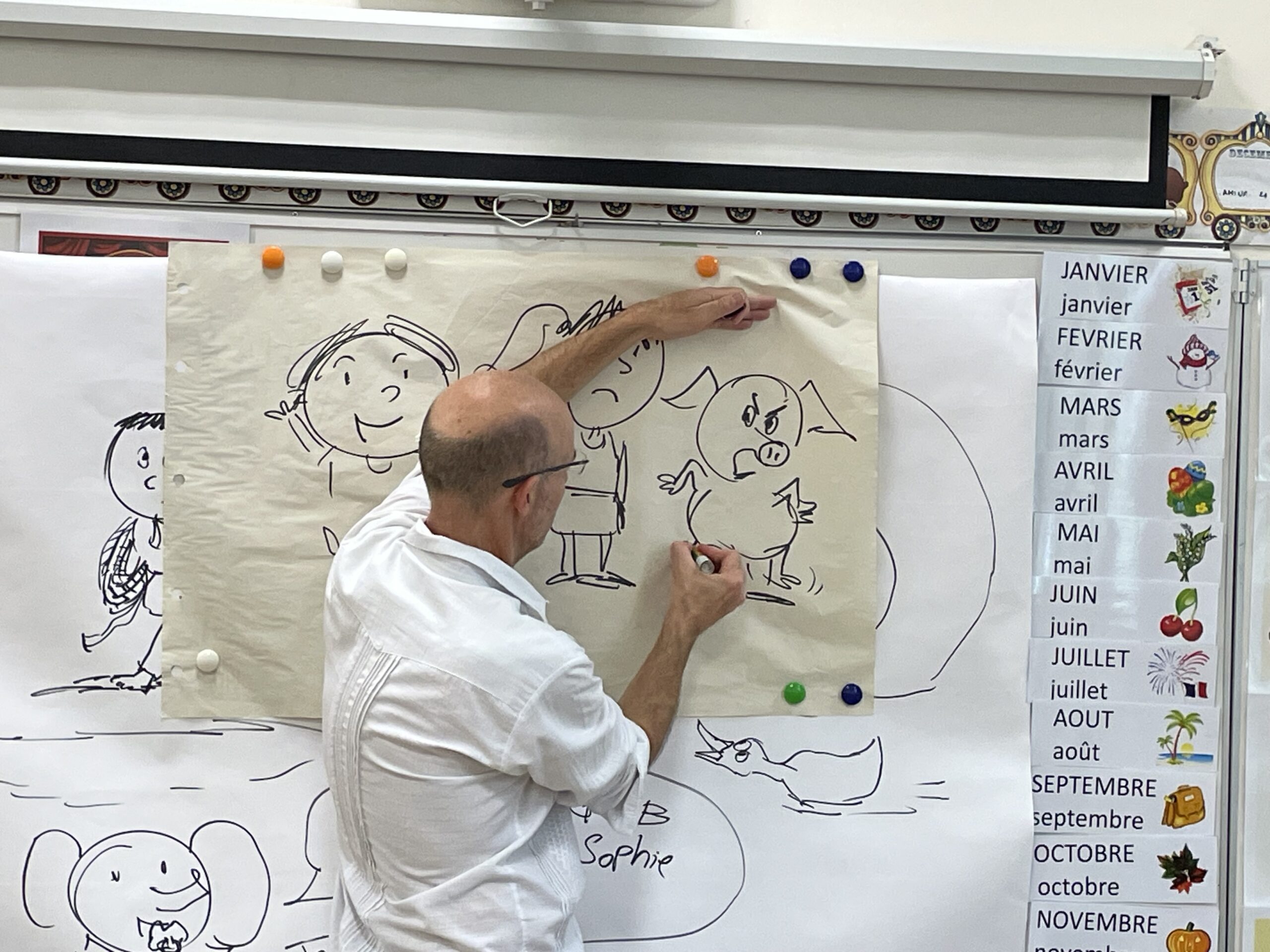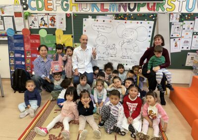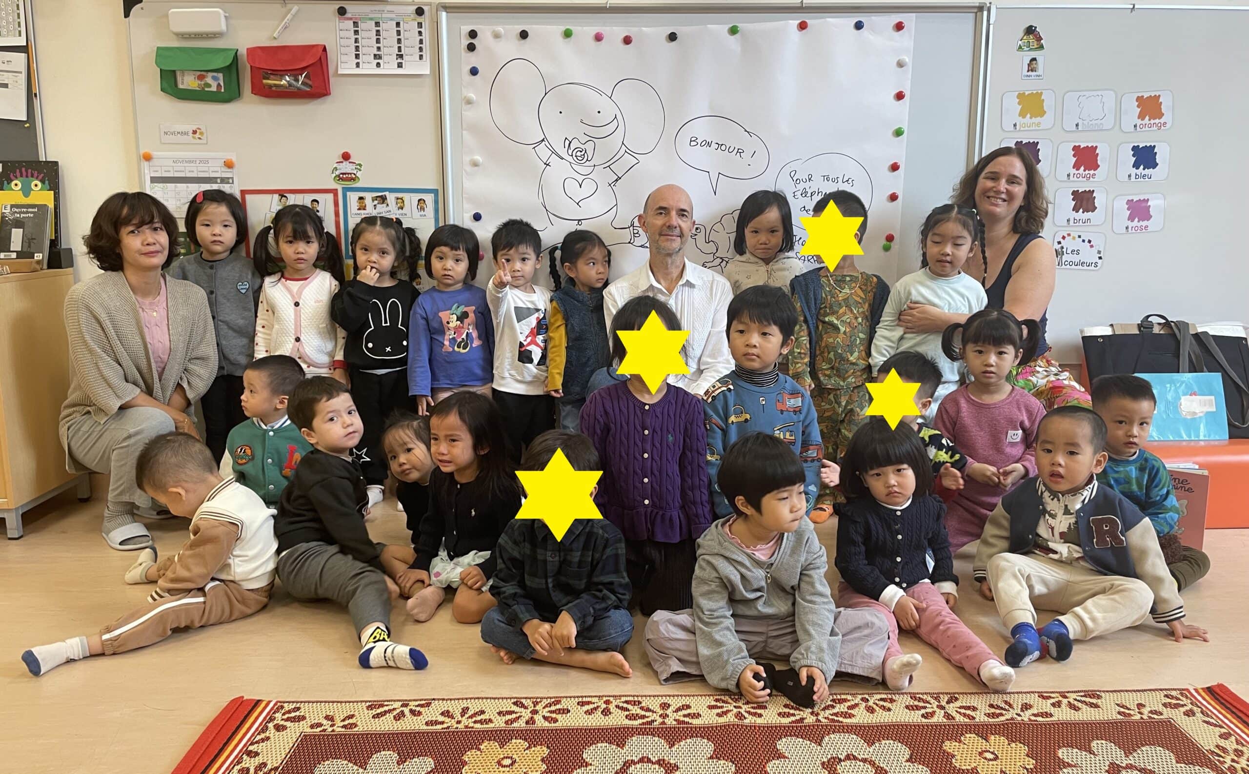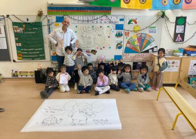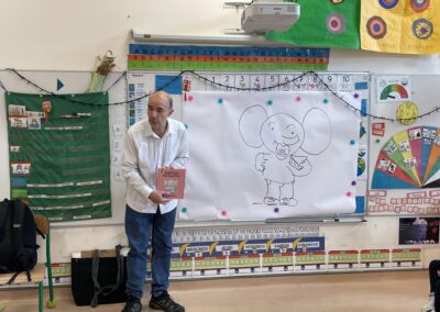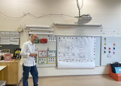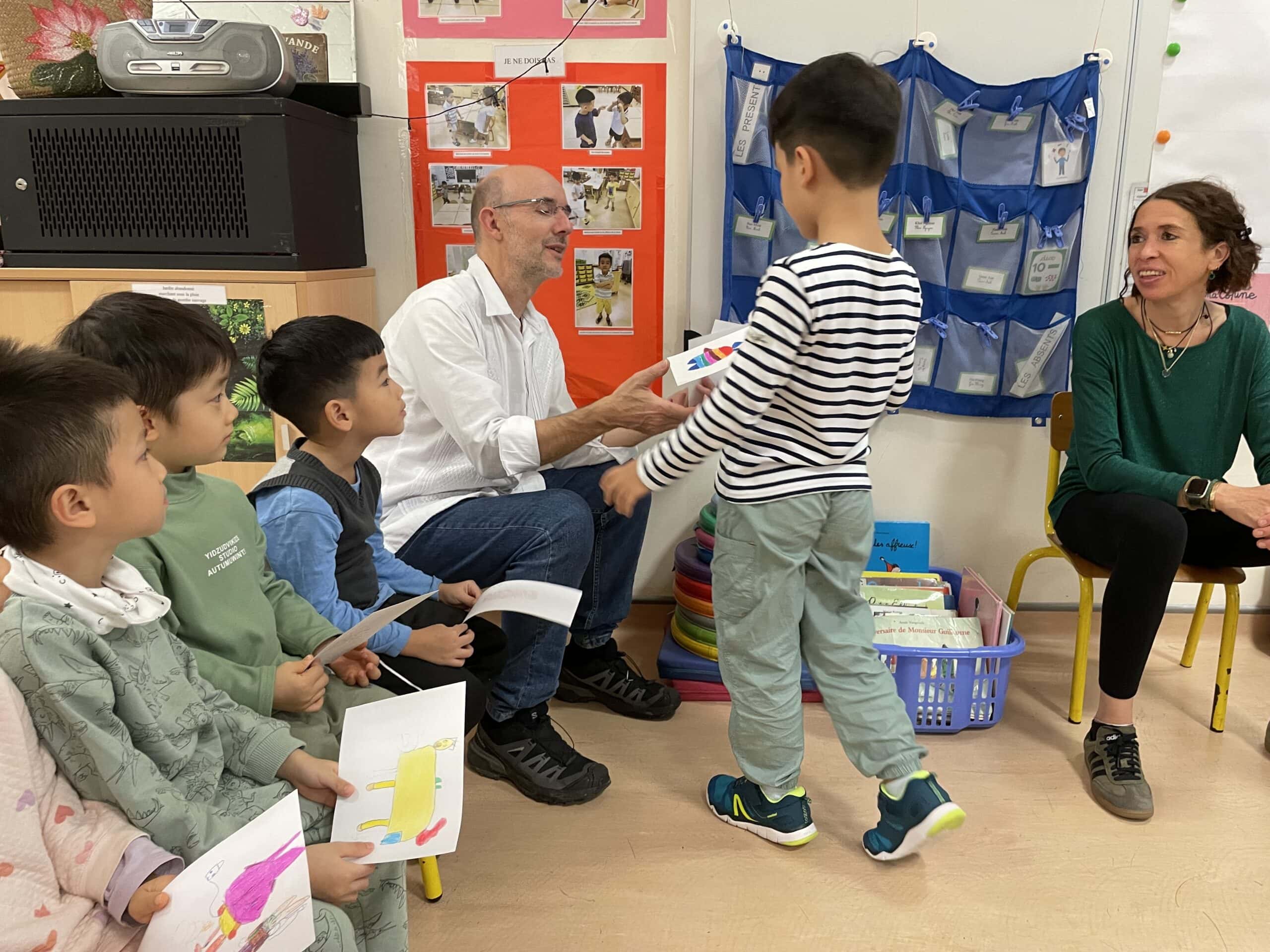 Il a parlé avec les plus petits de ses histoires (PSA, PSB et MSB) tout en leur montrant comment dessiner des formes simples. Il a travaillé sur les émotions avec les plus grands (GSB) et a découvert les textes et les dessins réalisés par les enfants sur leur doudou (GSA).